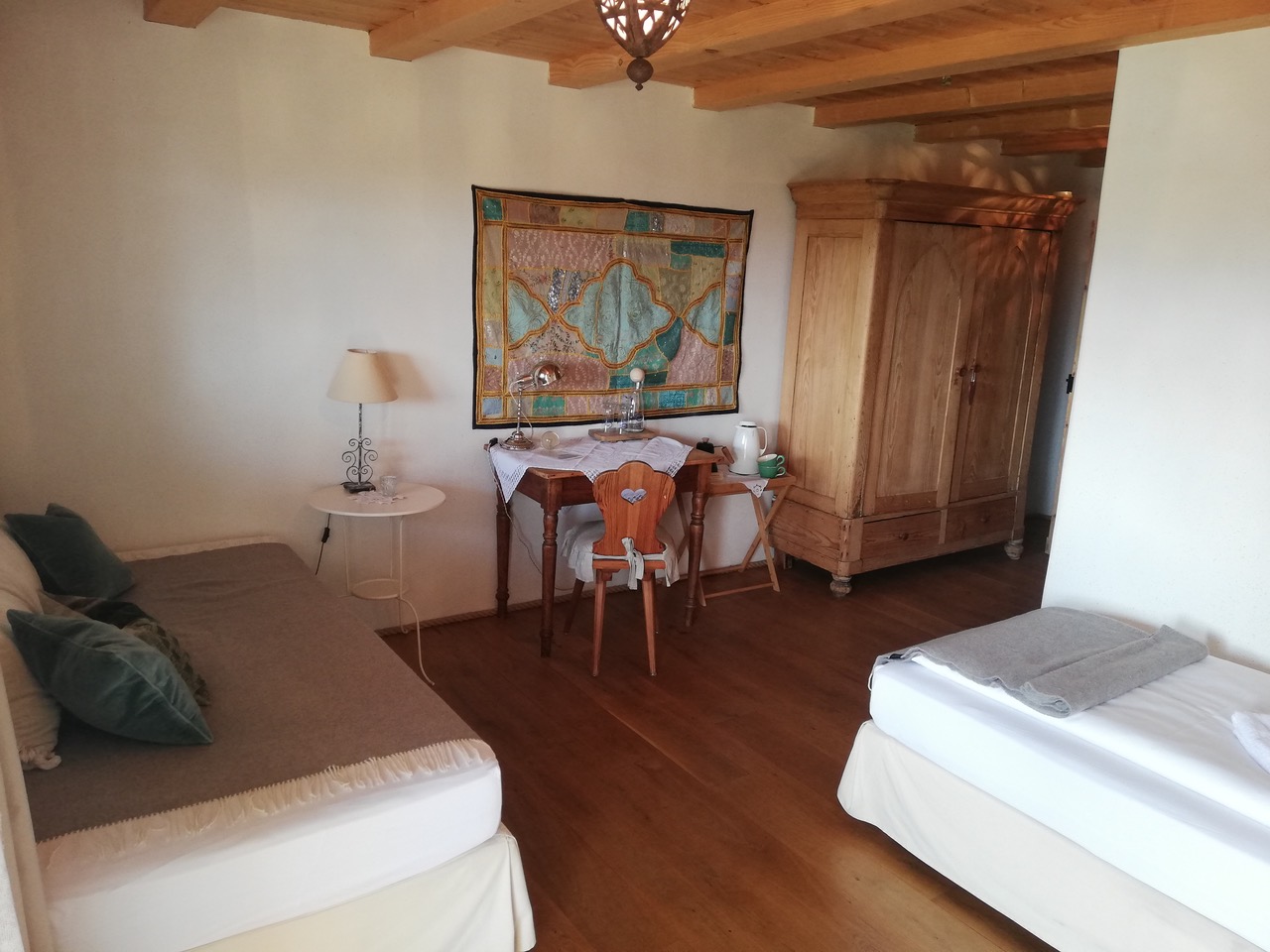 Die wunderschönen Doppel- und Zweibettzimmer sind fast ausschließlich mit nachhaltigen Naturmaterialien gestaltet und verfügen alle über ein eigenes Badezimmer, Wasserkocher und teilweise auch über einen eigenen Balkon.